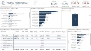 Dashboards that present revenue and profit by partner allow leadership to compare performance while also filtering the data by practice group, client, or matter. Selecting an individual partner can update the rest of the report to show the matters, clients, and teams contributing to that partner’s performance.